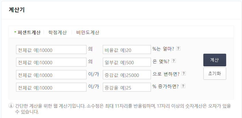 해당 내용은 퍼센트 계산법의 공식 계산법의 간단한 예제들입니다. [전체값에서 일부값은 몇 퍼센트인가? (일부값 ÷ 전체값 x 100) 예제로는 300에서 105 몇퍼센트일까? 35%입니다.] [전체값의 몇퍼센트는 얼마인가? (전체값 x 퍼센트 ÷ 100) 30의 35%는 105입니다.] [숫자를 몇 퍼센트 증가시키는 공식은? (숫자 x (1 + 퍼센트 ÷ 100) 예제로 1548을 66%로 증가하기위해서는 2569.68입니다.] [숫자를 몇퍼센트 감소하는 공식은?(숫자 x (1- % ÷ 100) 예제는 1548을 66% 감소하면 526.32 입니다.] 이런 퍼센트 계산법으로 사용하기 좋은 계산기로는 네이버 계산기가 가장 사용이 편하고 정확합니다.