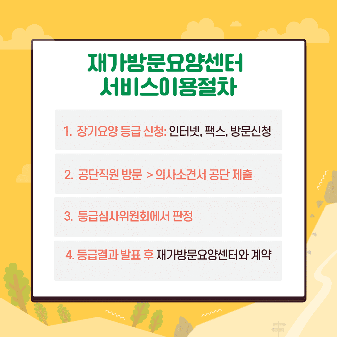 재가방문요양센터 서비스를 이용하기까지의 절차로는 이렇습니다. [국민건강보험공단 사이트 접속 > 장기요양등급 신청 > 공단 직원 방문 > 어르신 상태 체크 > 등급판정위원회 심사 > 2주 ~ 1달 이상 후에 결과 발표(심사보류될 수도 있음) > 등급판정 후 재가방문요양센터 선택 > 센터에 필요 서류 제출 (센터마다 제출서류 종류가 다름) > 서류 상태에 따라서 요양보호사 면접 후 매칭 > 매칭 후 요양서비스 지원 > 어르신 케어 진행] 지금 설명드린 절차도 축소한 부분이라고 할 수 있습니다.