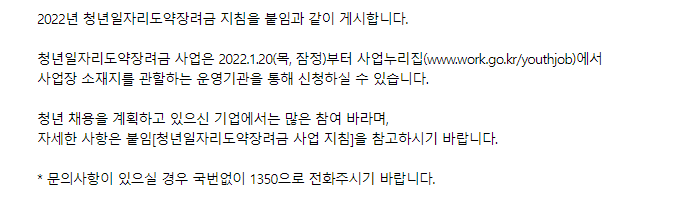 청년일자리도약장려금지원내용은? 신규채용 청년들 1인당 월 80만원, 연 최대 960만원 / 지원한도는 고용보험 피보험자 수의 50%, 최대 30명 / 주기는 최소 고용유지기간(6개월) 후 2개월 이후 2개월 단위 입니다. 회사별 고용한 인원의 50%, 비수도권 100% 까지 최대 30명 지원이 가능하다고 합니다. 기업들의 운영기관에 장려금 신청을 하시는데 각 시도별 운영기관이 달라 잘 확인해야 합니다. 신청방법은? 청년일자리도약장려금 홈페이지에 접속하셔서 신청하시면 됩니다. 회원가입을 꼭 하시고 신청하시기 바랍니다. 2023년에도 진행할지는 모르지만 자세한 사항은 1350번으로 문의하시면 될듯 합니다.