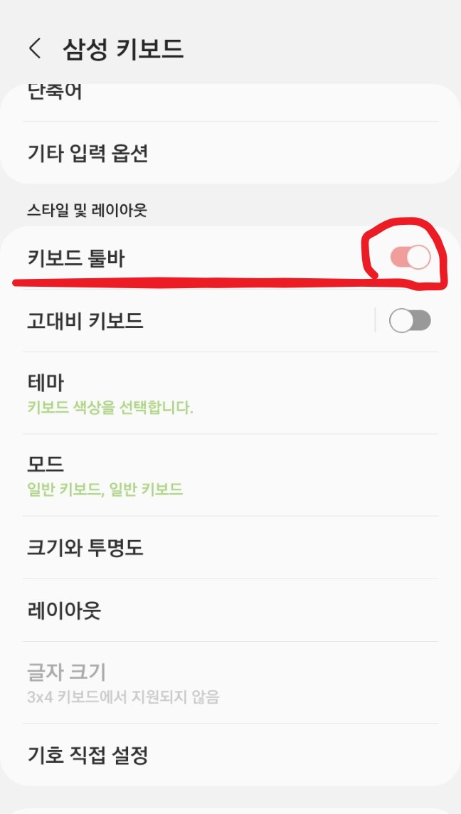 그리고 아래 보면 키보드 툴바라고 하여 설정아이콘이 보이는 것이 싫은 분들도 있습니다. 이것 또한 설정아이콘을 눌러서 삼성 키보드로 들어가시면 '키보드 툴바'를 OFF로 바꿔 주시면 됩니다. 그럼 굉장히 깔끔하게 정리가 됩니다. 처음 업데이트 되고 나왔을 때는 신기해서 사용하게 됬지만 솔직히 지금은 굉장히 걸리적 거리는 기능들이기도 해서 잘 사용을 안하게 됩니다. 그럼 글 내용이 참고되셨길 바랍니다.