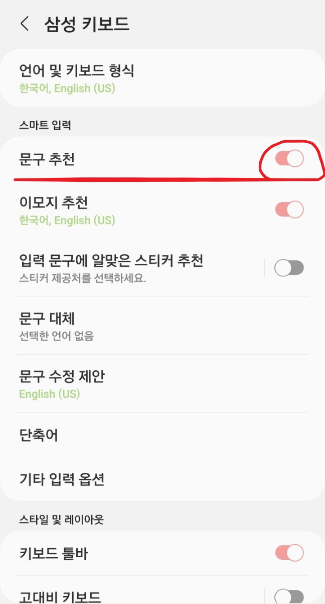 두번째 설정 화면에 들어가셔서 삼성 키보드로 넘어간 화면이 보입니다. 여기서 문구 추천이란 항목이 있습니다. 이것이 'ON' 으로 되어있는데 이것을 'OFF' 꺼주시면 됩니다.