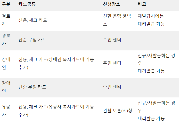 그래서 서울 경로우대 교통카드 발급은 [신한은행영업소, 주민센터, 관핣보훈청]에서 발급이 가능합니다. 아래 표를 참고하시기 바랍니다. / 경기지역경로우대교통카드는 서울과 동일하게 적용되고 발급장소는 경기도 내에 있는 NH농협은행 전영업점에서 발급이 가능하다고 합니다. 신분증만 지참하시면요! / 부산 지역 경로우대 교통카드 발급은 주민센터에서 발급이 가능하고 종류는 어르신교통카드, 복지교통카드, 국가유공자교통카드로 나뉘어져 있으며 이에 따른 필요한 구비서류들이 있으니 꼭 참고하시기 바랍니다.