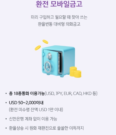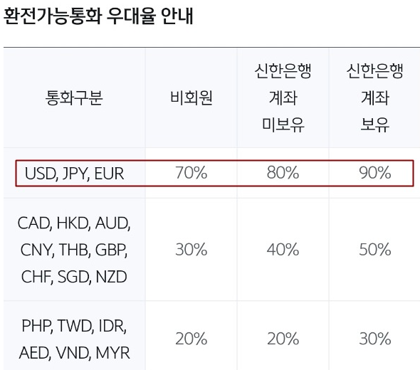 현재 여러 증권사들에서도 외화예금의 환테크를 위하여 여러 방법들을 찾아보고 있으나 결국은 우대율이 높은 신한은행에서 환전 모바일금고가 가장 좋은 듯 하더라구요. 현재 신한은행의 계좌를 보유하고 있다면 90%까지 우대하여 환전수수료를 할인받을 수 있으나 매도 할 때는 90% 적용받을 수 없다는 것이 조금 아쉽지만요 신한은행 계좌가 없다면 처음 지점을 방문하여 입출금 통장부터 개설해야 합니다. 입출금 통장에 환전할 금액만큼 입금하고 모바일금고롤 들어가서 금고 입금, 환전금액을 입력하시면 우대율과 예상금액을 확인할 수 있으니 참고하세요.