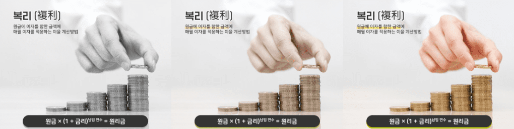 복리는 단리랑은 다르게 원금뿐이 아닌 그 이자에 대해서도 일정 기간 정해 놓은 이자율을 적용해서 지급하는 이자라고 할 수 있습니다. 즉 이자에 이자가 붙는 것입니다. 원금에 대한 이자가 붙는 단리보다 이자에 이자가 붙는 복리가 같은 기간이라고 해도 훨씬 많은 금액을 모을 수 있는 부분입니다. [복리계산법 (현재가치 x {(1+ 금리)기간}] 입니다. 예시로는 1천만원의 돈을 연 3%의 이자율로 3년동안 복리 예치하면 [1천만원 x{(1 +0.03)3)} =1천9십4만원돈이 되게 됩니다. 솔직히 지금 설명드리는게 이해가 안되실 수도 있습니다. 그래서 복리계산기를 이용해서 좀더 쉽게 계산해보시기 바랍니다. [참고링크] 해당 사이트를 통해서 복리계산을 제대로 해보시기 바랍니다.