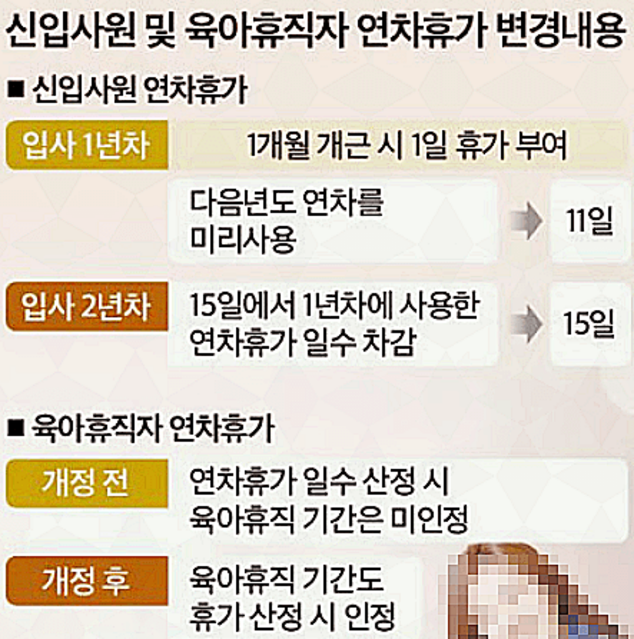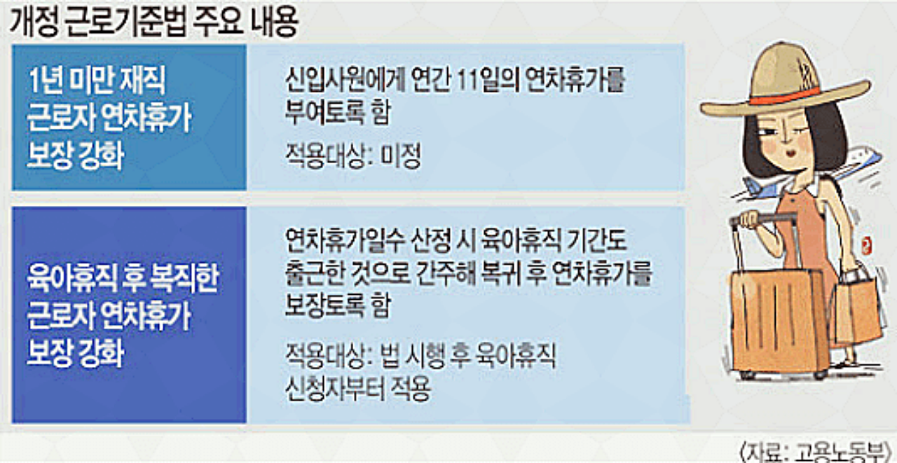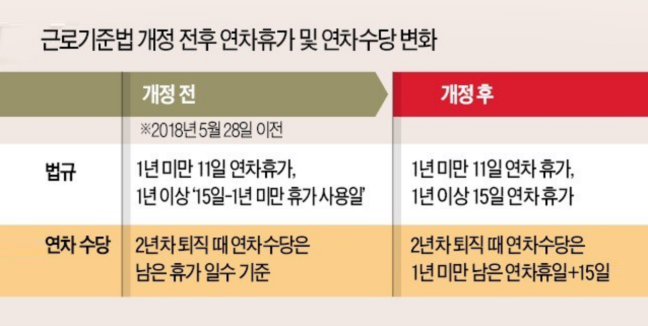 또 퇴직을 하게 되실 때 연차수당 계산법으로는 지금까지 위에 말씀드렸던 1년 미만근무, 1년이상 2년 미만 근무일 때는 금액이 있습니다. 1년 미만은 1개씩 생기는 연차수에 대한 연차수당을 받을 수 있으며, 1년이상 2년미만은 1년차, 1년미만에 사용안된 모든 연차를 연차 수당으로 지급 받으실 수 있습니다. 그리고 공휴일을 연차휴가로 대처하는 행위가 50인 이상 사업장은 2021년부터, 5인 이상 사업장은 2022년 부터 금지되었다고 합니다. 그러니 꼭 해당 부분을 확인하시고 취업하시기 바랍니다. 또 육아휴직자에 대한 연차휴가는 해당 법률이 개정되어서 육아휴직 기간에도 휴가 산정시 인정을 받을 수 있게 되어있다고 합니다. 그렇다면 위에 설명드렸던 연차수당에 대한 부분들도 전부 해당되게 되는 것입니다.